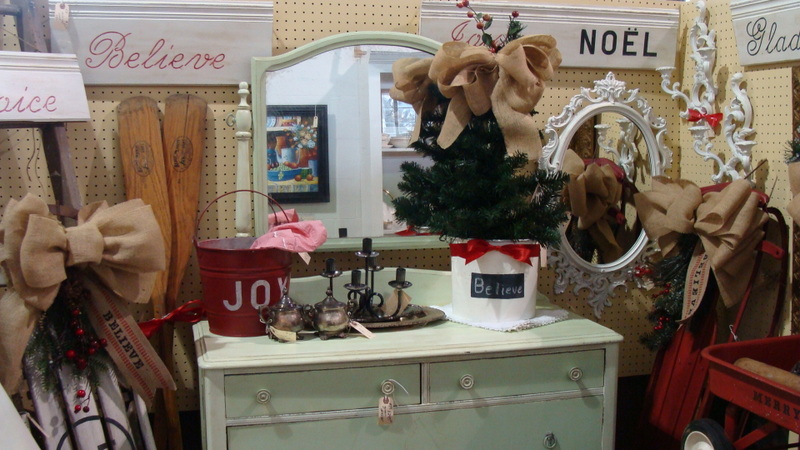 I have been very busy putting together some Christmas items for my booth.  I collected old sleds and skates at estate sales throughout the year.  This sled got a coat of red spray paint, a large burlap bow, and this upholstery webbing "Believe".